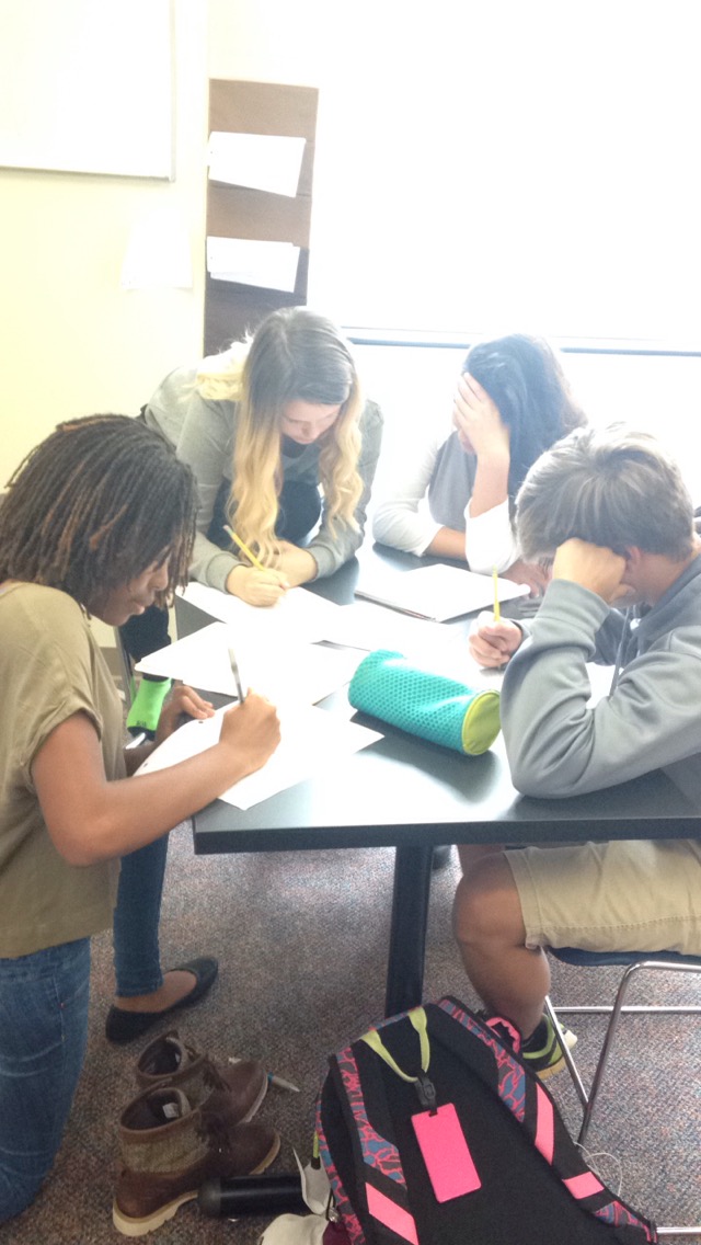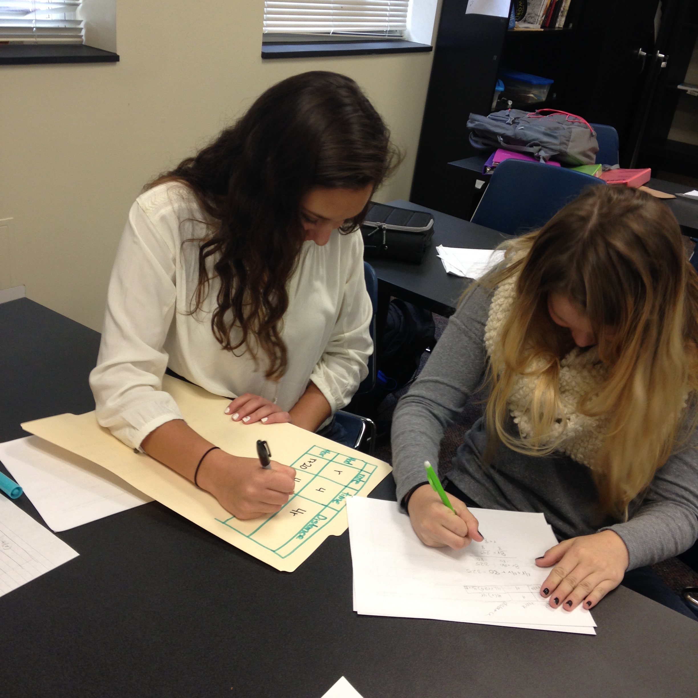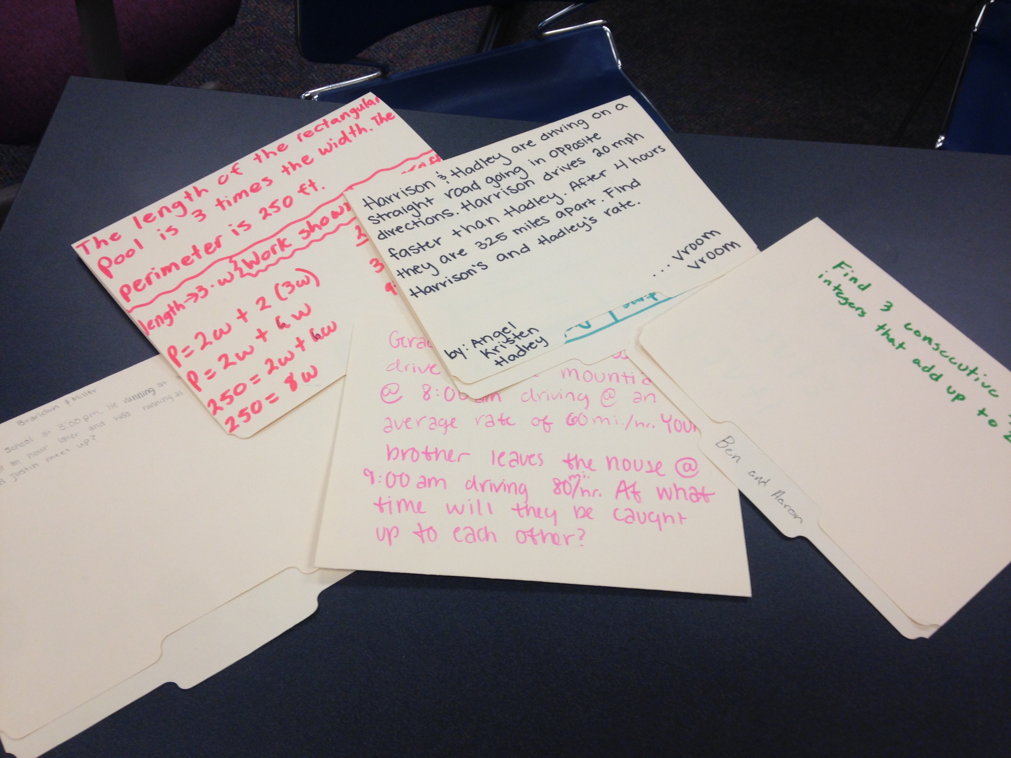 I next decided to use these folders in my algebra 1 class for teaching word problems. This particular class has A LOT of energy. It’s hard to get them to focus and take notes. I’ve been trying to figure out a way to have them practice word problems (perimeter, consecutive numbers, uniform motion). Students already filled in notes with notes with me and had examples of every type of word problem. Instead of giving students multiple problems to practice, I broke the class into partners and gave each group a word problem. It was each group’s job to complete the word problem and call me over when they finished. Once a group completed the problem correctly they had to copy their problem onto the manilla folder. On the front of the folder, they had to write the word problem. On the inside of the folder, they had to draw a chart (if necessary) and show their algebraic work. They also had to write their answer to the question out in complete sentences. Students finished at different rates so this activity gave me plenty of time to walk around and help students and check for understanding.