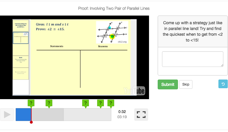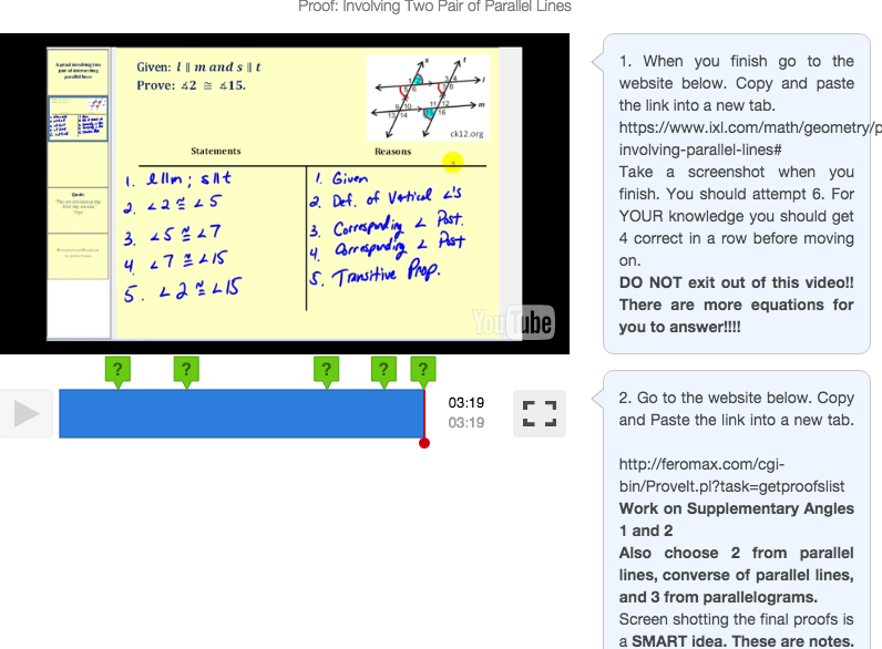 I didn’t make my own video, but found a one that walked students through a formal proof. During the video I created scaffolding questions. I wanted my students to be engaged in the video. Just like with flipped classroom videos, the length of the video should be 7 minutes tops! If you need the video to be longer you should split it up into multiple videos. I noticed that students zone off if it the video is too long.