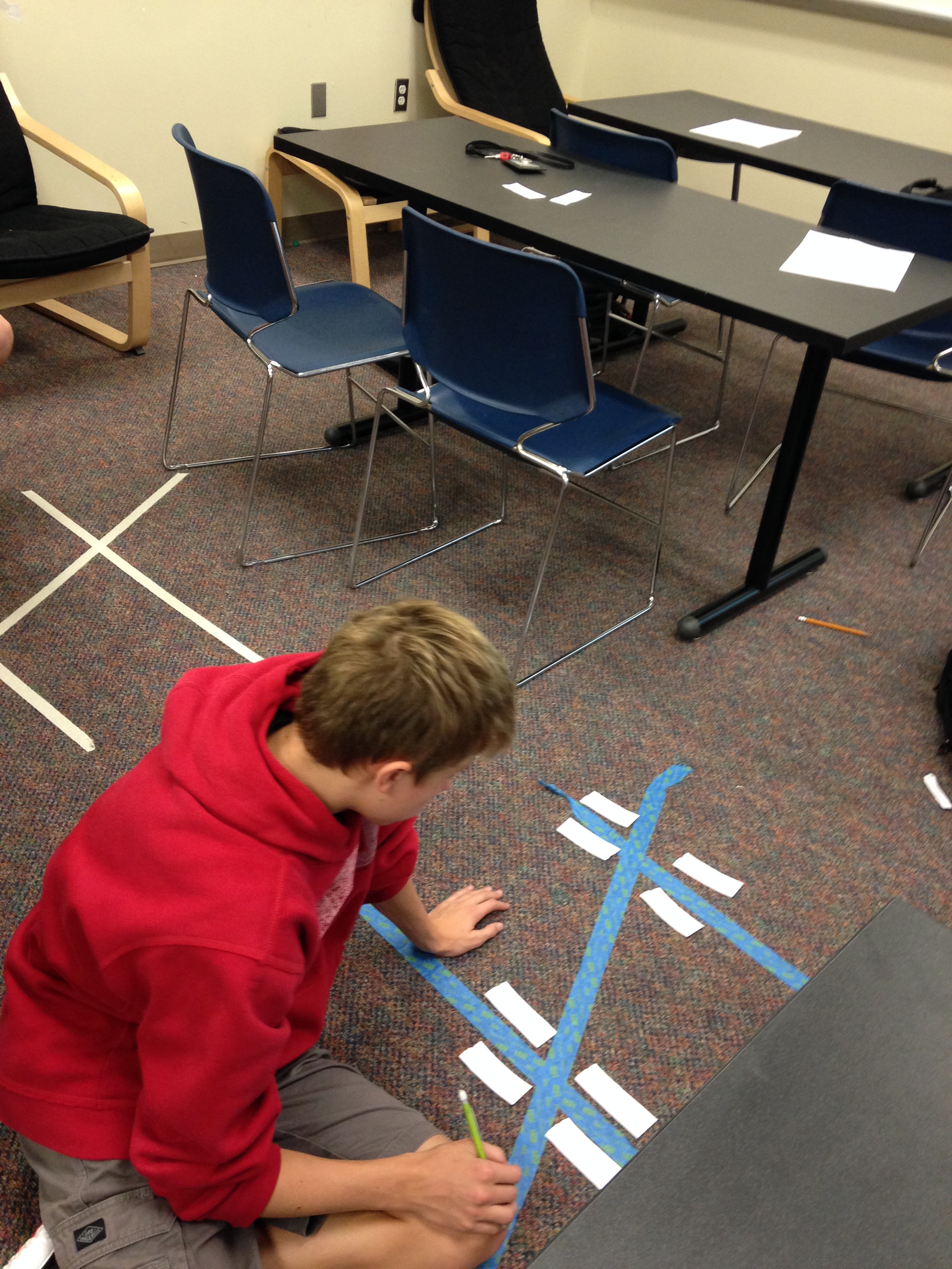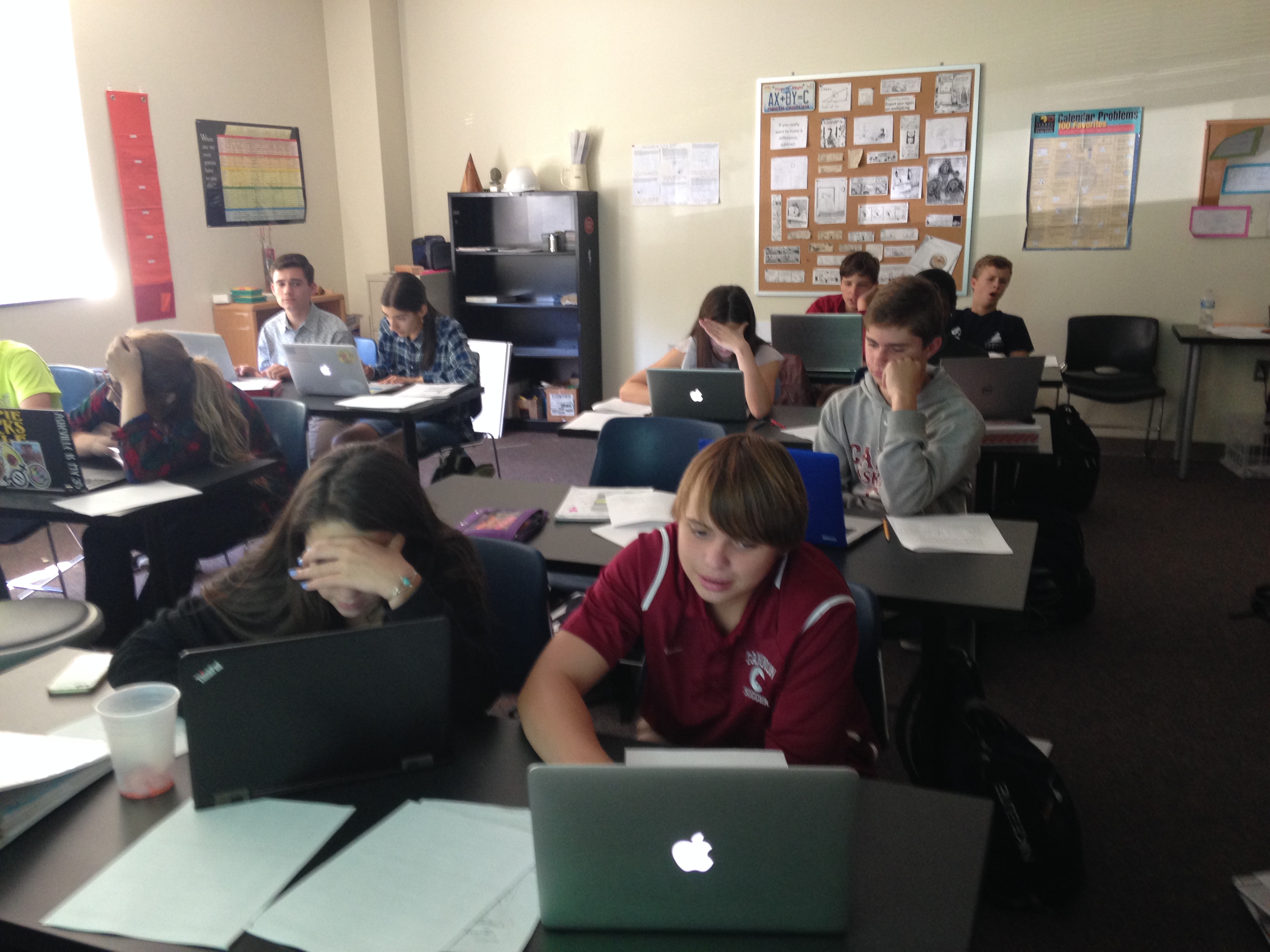 Although there were only 7 sets of problems, I doubled them to create 14 stations. The maximum number of students I have in my classes is 20, so this ensured that there would be no more than 2 students at a particular station. I really liked this because it allowed my students to work with partners, but not in large groups. Students were also moving around the entire time! Some students did take pictures of the questions and went back to their seats… ugh… but most students stayed at their station. Because I had the stations taped to the walls (and one in the middle) I could see every student working. I could also see which students were struggling. It was also entertaining watching my students search for the stations they needed!